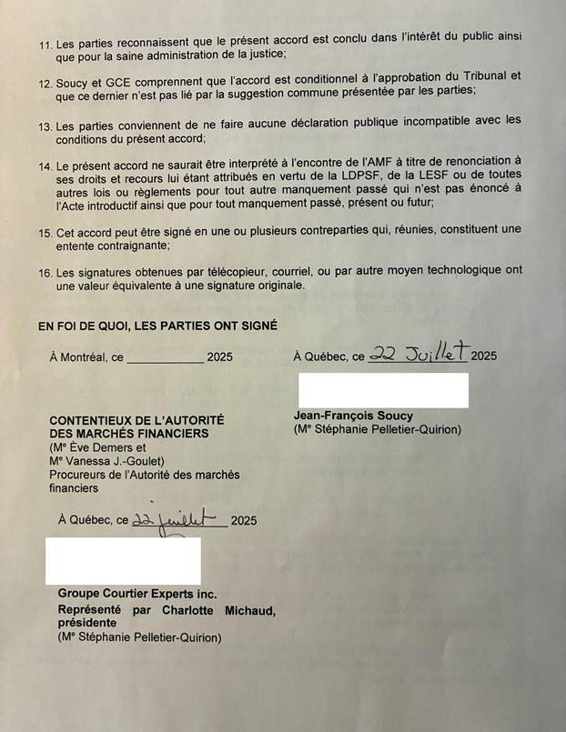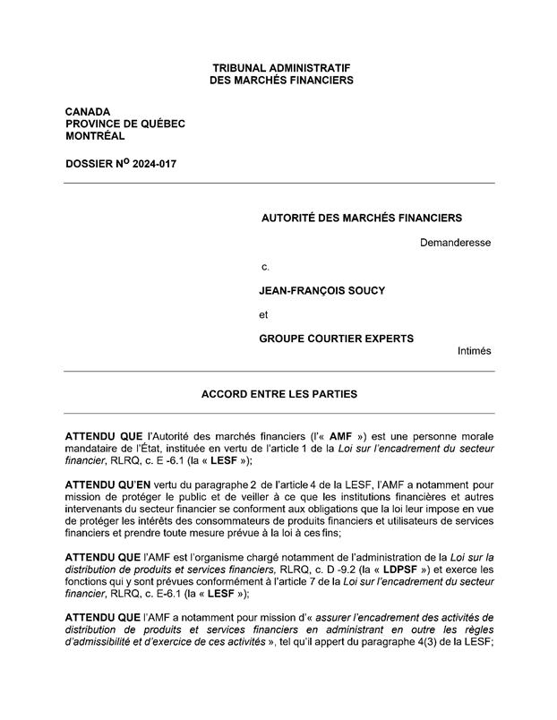 [1] L’Autorité des marchés financiers (« l’Autorité »), Jean-François Soucy et Groupe Courtiers Experts inc. demandent au Tribunal d’entériner un accord conclu entre eux en août 2025 (« Accord »)[1]. Le Tribunal doit donc déterminer si l’Accord est « conforme à la loi »[2] lui permettant de l’entériner et de prononcer les ordonnances suggérées par les parties.