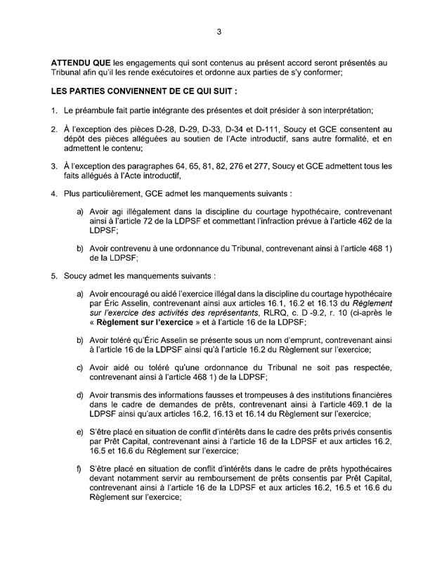 [13] En ce qui concerne le premier critère permettant au Tribunal d’entériner un accord, soit la preuve de l’existence de manquements aux lois en vertu desquelles le Tribunal exerce sa compétence, à la lumière (1) des admissions de Jean-François Soucy et de Groupe Courtiers Experts inc. des faits énoncés à l’Acte introductif, (2) des admissions contenues dans l’Accord et (3) des admissions quant au contenu des pièces produites, le Tribunal confirme l’existence de manquements à la LDPSF et au Règlement sur l’exercice des activités des représentants.