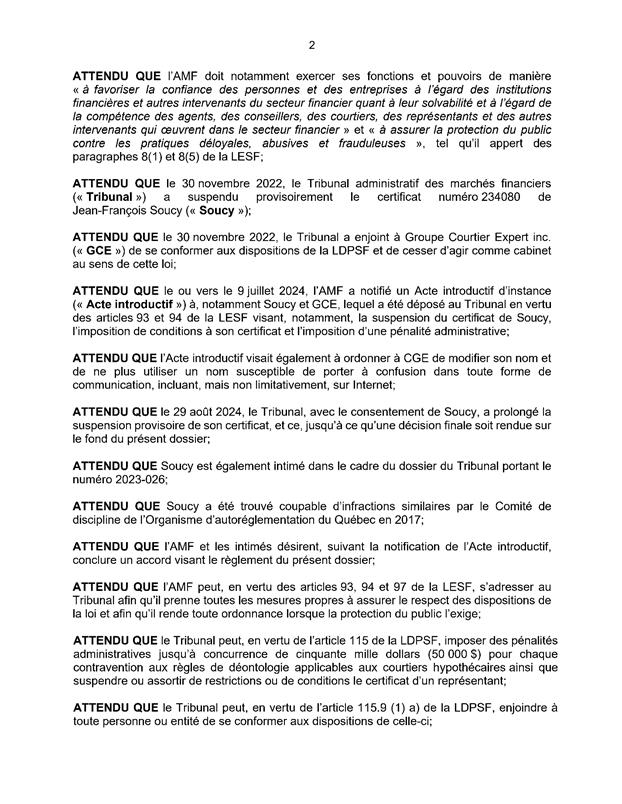 [7] En juillet 2024, l’Autorité dépose dans le présent dossier un acte introductif (« Acte introductif ») à l’encontre de Jean-François Soucy, Éric Asselin, Alexandre Giroux et Groupe Courtiers Experts inc. dans lequel elle demande au Tribunal de prononcer plusieurs ordonnances et d’imposer des pénalités administratives en raison d’importants manquements à la LDPSF et au Règlement sur l’exercice des activités des représentants relativement au courtage hypothécaire.