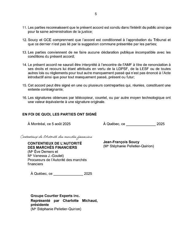 PREND ACTE de l’engagement de Jean-François Soucy et de Groupe Courtiers Experts inc., envers le Tribunal administratif des marchés financiers, de modifier officiellement le nom de Groupe Courtiers Experts inc. pour « Gestion CM inc. », et ce, au plus tard le 31 octobre 2025, dans toute forme de communication, incluant, mais non limitativement sur Internet.
