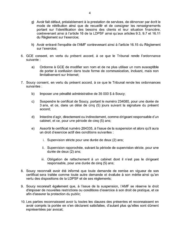 [17] En raison des manquements qu’il a admis, qui sont par ailleurs constatés par le Tribunal, Jean-François Soucy consent à ce que le Tribunal :