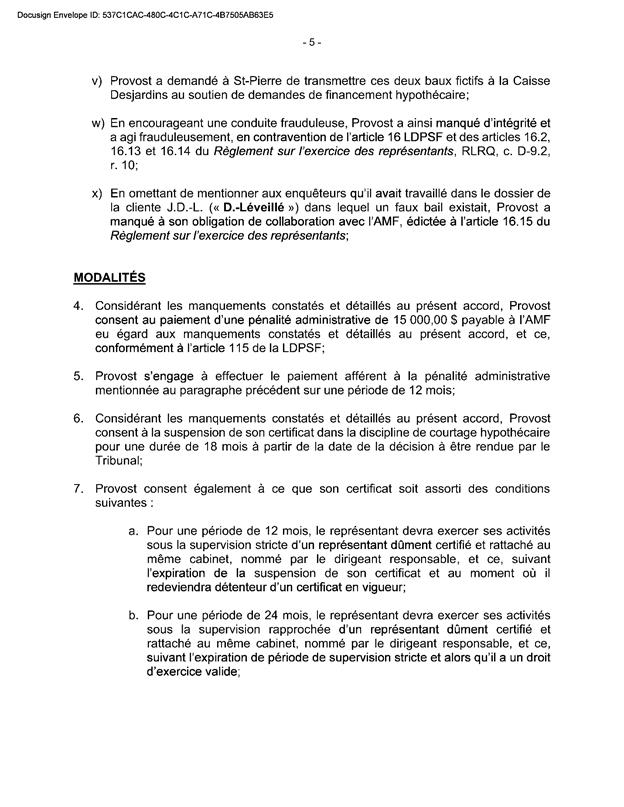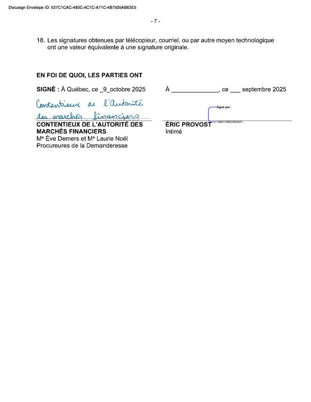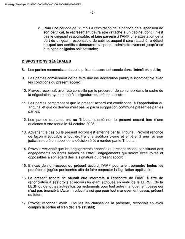 [4] Lors d’une audience tenue le 14 octobre, la procureure de l’Autorité a présenté au Tribunal les modalités de l’Accord et Éric Provost était présent, accompagné de son avocat, et il a confirmé au Tribunal consentir à l’Accord.