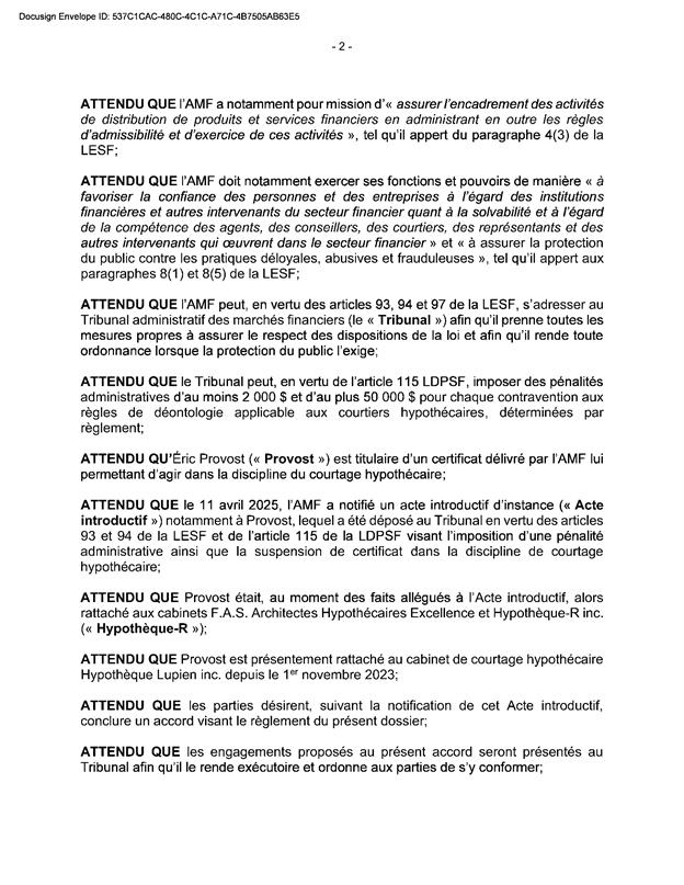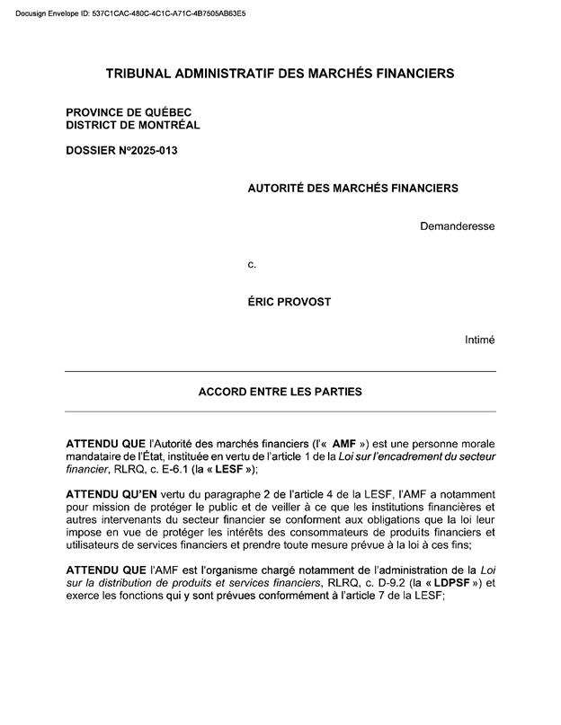 [2] Suivant le dépôt de cet acte introductif d’instance, l’Autorité et Éric Provost ont conclu un accord visant le règlement du dossier à son égard (« Accord »)[4].