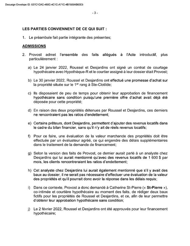 [14] Le Tribunal a également constaté qu’Éric Provost admet aussi les pièces mentionnées au soutien de l’acte introductif d’instance. Cependant, celles-ci n’ont pas été produites au dossier à ce stade. Nonobstant ce fait, la preuve offerte par les parties est suffisante pour permettre au Tribunal d’entériner l’accord.