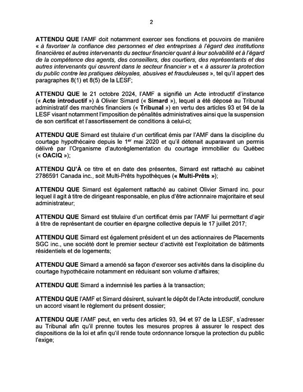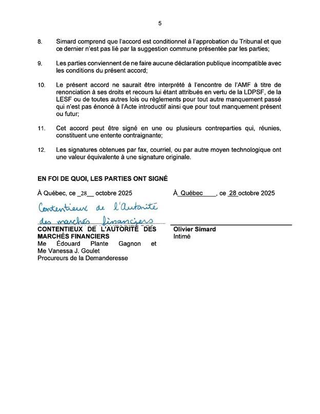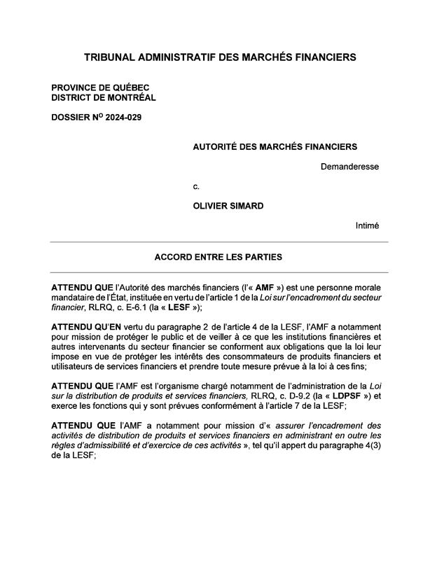 [1] Le Tribunal est saisi d’une demande pour entériner un accord visant le règlement de la présente affaire (« Accord »)[1] entre l’Autorité des marchés financiers (« Autorité ») et Olivier Simard (« Intimé »).