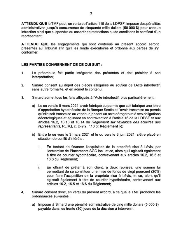 [20] Selon le Tribunal, l’Accord permet d’établir sa compétence par la démonstration de manquements sur lesquels il peut statuer. En effet, l’Intimé a notamment fait des représentations fausses ou trompeuses relativement à une lettre d’approbation hypothécaire[10] et s’est placé en situation de conflits d’intérêts en offrant différentes formes de financement à un client[11].