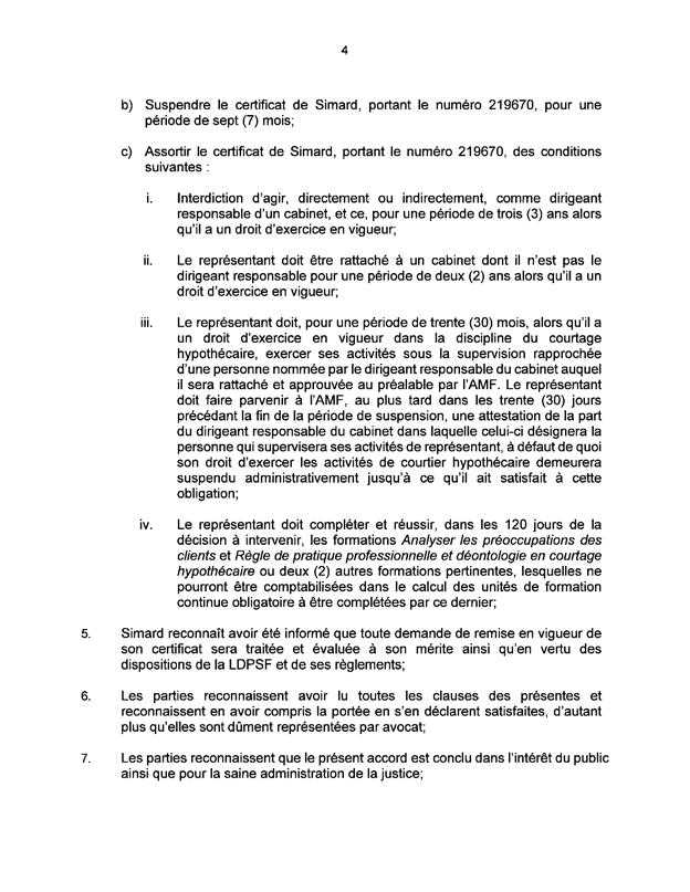 • L’assortiment de conditions à son certificat soit : une interdiction d’agir comme dirigeant responsable pour une période de 3 ans, un rattachement à un cabinet pour lequel il n’est pas un dirigeant responsable pour une période de 2 ans, une supervision de ses activités pour une période de 30 mois et le suivi de 2 formations pertinentes.