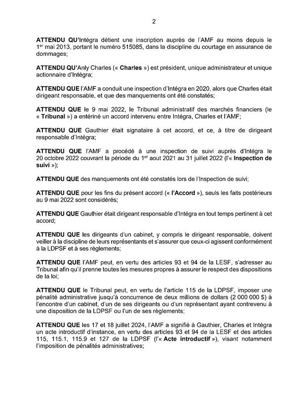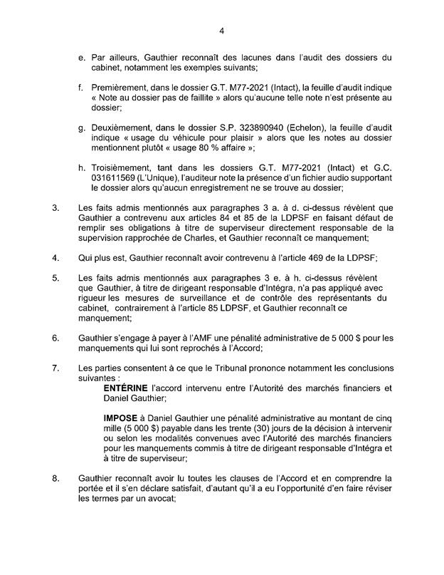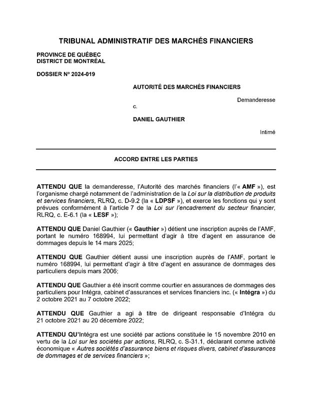 [1] Le Tribunal est saisi d’une demande pour entériner un accord visant le règlement de la présente affaire (« Accord »)[1] entre l’Autorité des marchés financiers (« Autorité ») et Daniel Gauthier (« Intimé »). L’Accord suit le dépôt d’un acte introductif modifié à l’encontre de l’Intimé, d’Anly Charles et du cabinet Intégra[2], alléguant divers manquements à la Loi sur la distribution de produits et services financiers[3] et ses règlements.