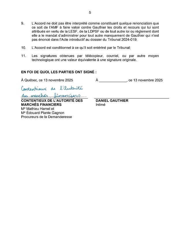 ENTÉRINE l’accord intervenu entre l’Autorité des marchés financiers et Daniel Gauthier, PREND ACTE des engagements qu’il contient, le REND exécutoire et ORDONNE aux parties de s’y conformer;