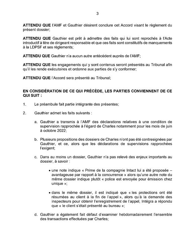 [2] Intégra, cabinet d’assurances et de services financiers (« Intégra »). Les admissions de l’Intimé dans l’Accord et les motifs de la présente décision ne lient pas les autres parties visées par l’acte introductif modifié.